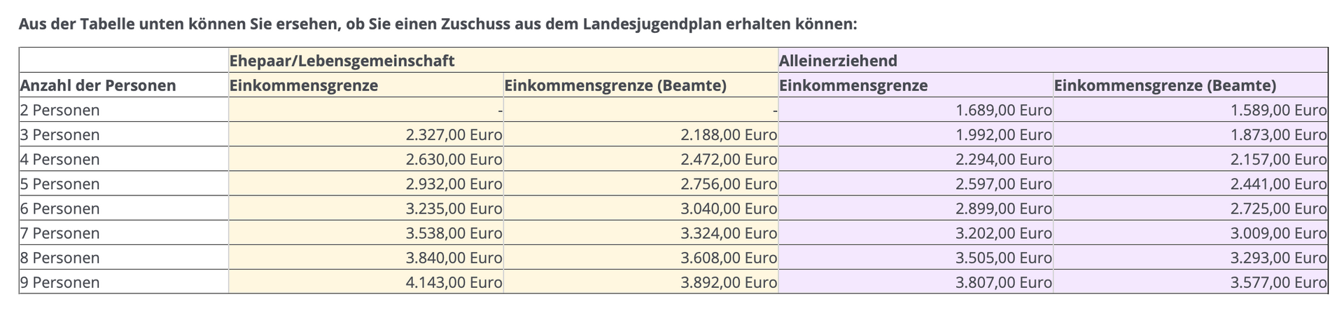 Aus untenstehender Tabelle können Sie entnehmen, ob Sie einen Zuschuss aus dem Landesjugendplan erhalten können.